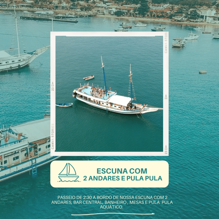 Descubra o paraíso de Búzios em grande estilo: embarque em uma luxuosa escuna e desfrute de 2h30 de pura diversão e conforto em alto mar com a Búzios Dicas!